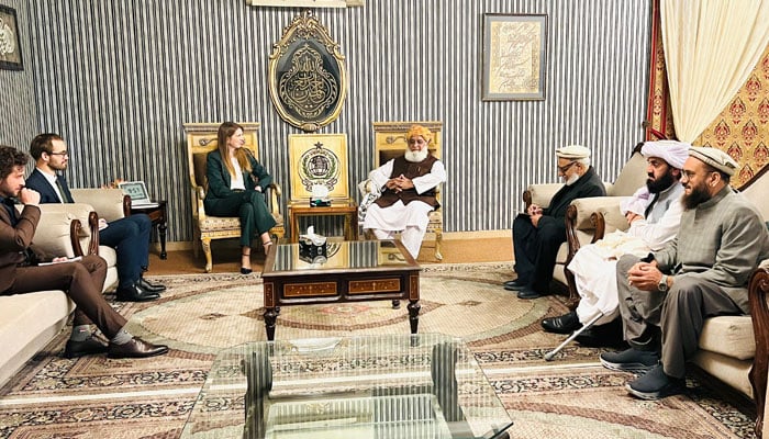 برٹش ہائی کمشنر جین میریٹ، پولیٹیکل سیکرٹری سیم فلیچر کی جے یو آئی کے سربراہ مولانا فضل...